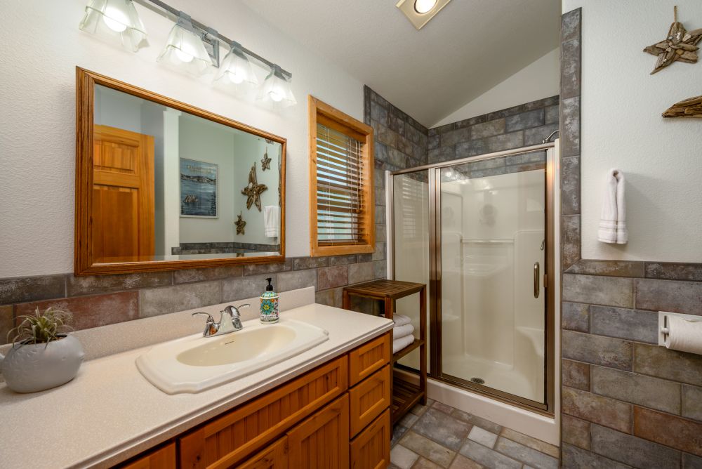 Both master bedrooms have ensuite bathrooms with showers and one also has a jetted bathtub. The other bedrooms share the main bath and the pool room full bathroom with a shower.